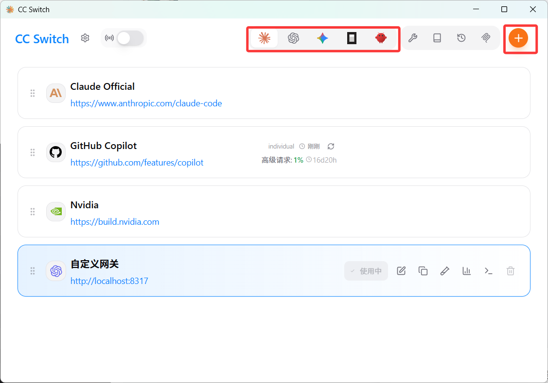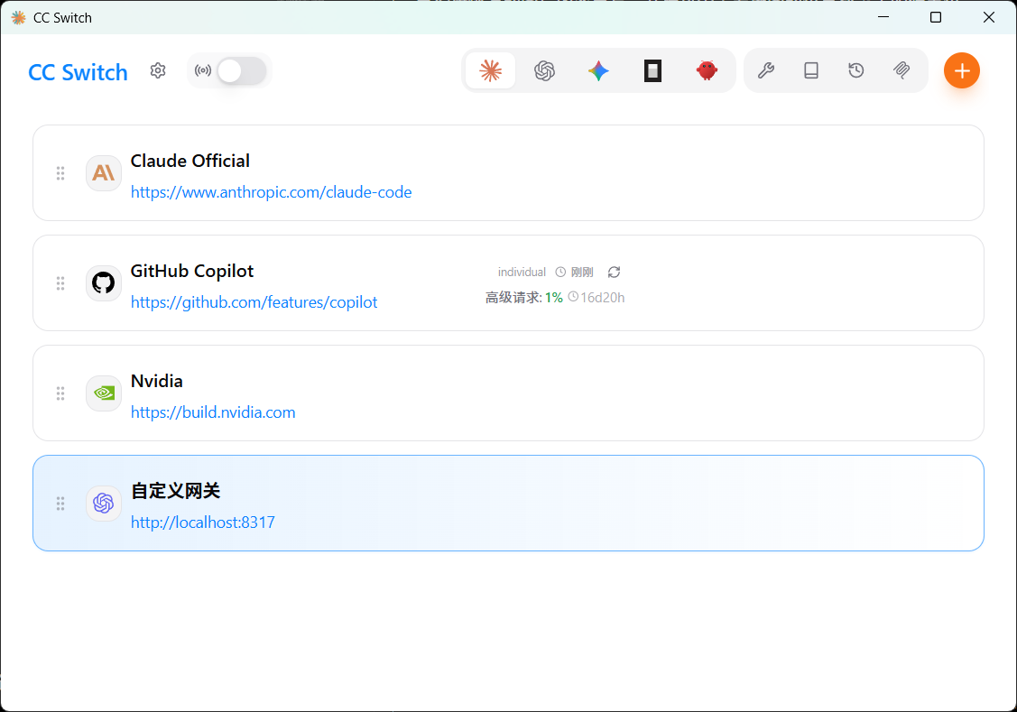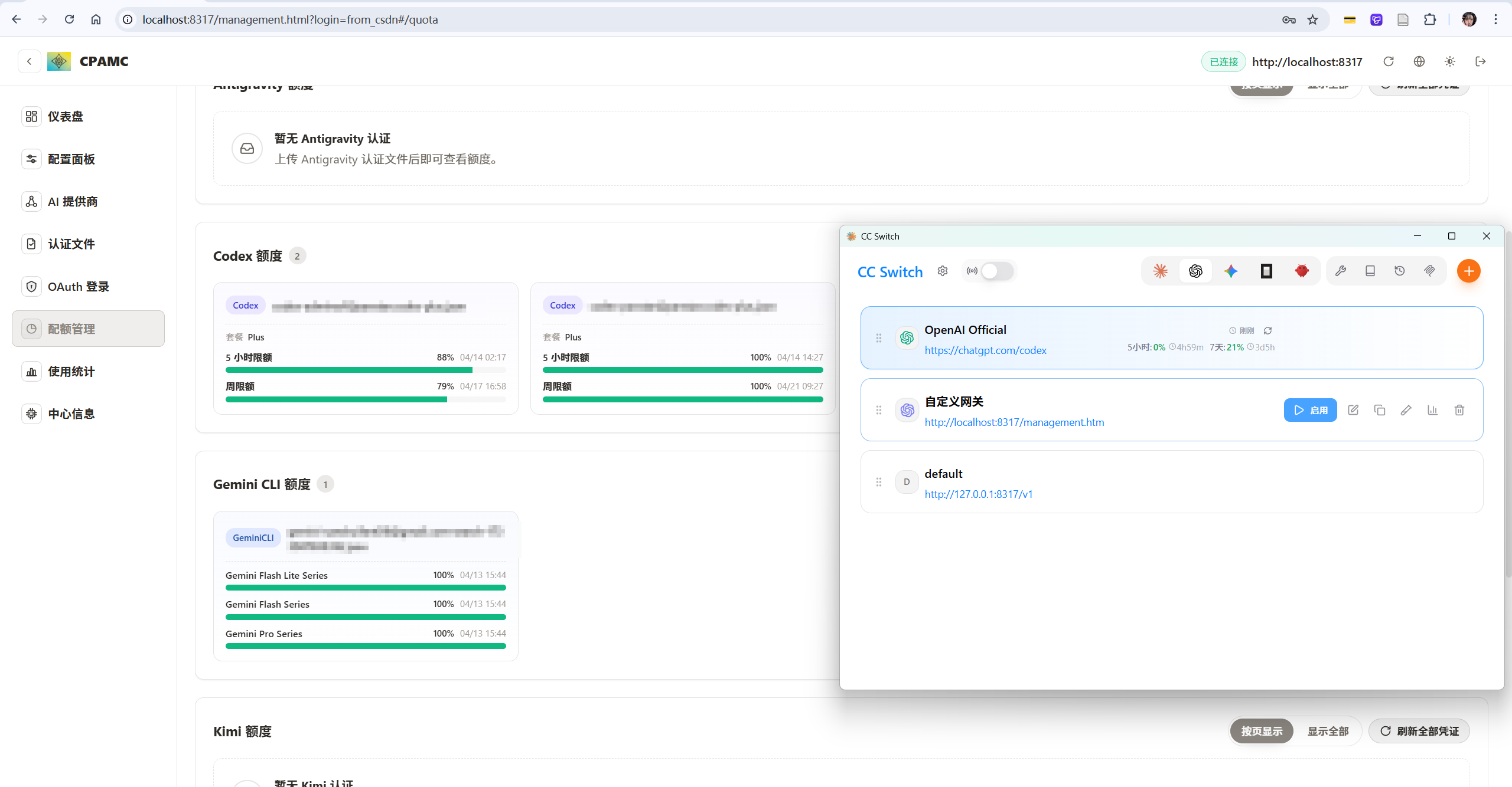 - 利用 cc-switch 把 CPA 反代出来的 API 接入到 Codex 和 Claude Code 中,并且支持快速切换配置。